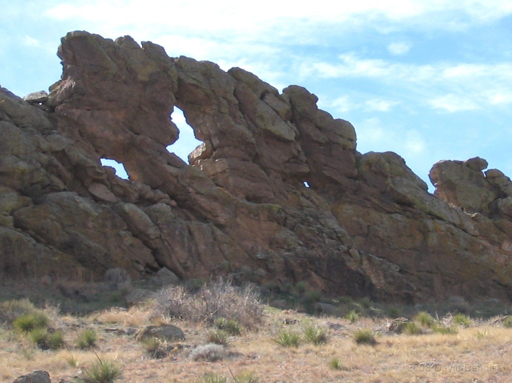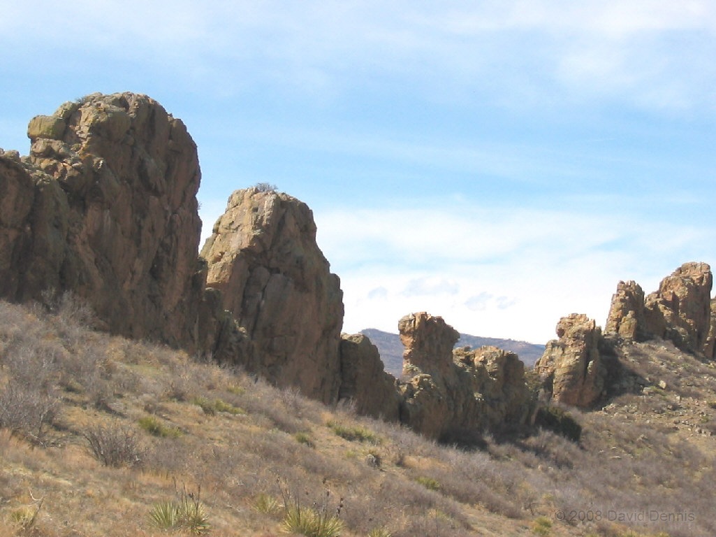 On U.S. Highway 34 just west of Loveland, Colorado there is a jagged ridge of sandstone rocks that is named The Devil's Backbone. Much of the area is now The Devil's Backbone Open Space, a park administered by the city of Loveland with several nice trails for hiking or biking. These photographs were taken in March 2005 late in the day.