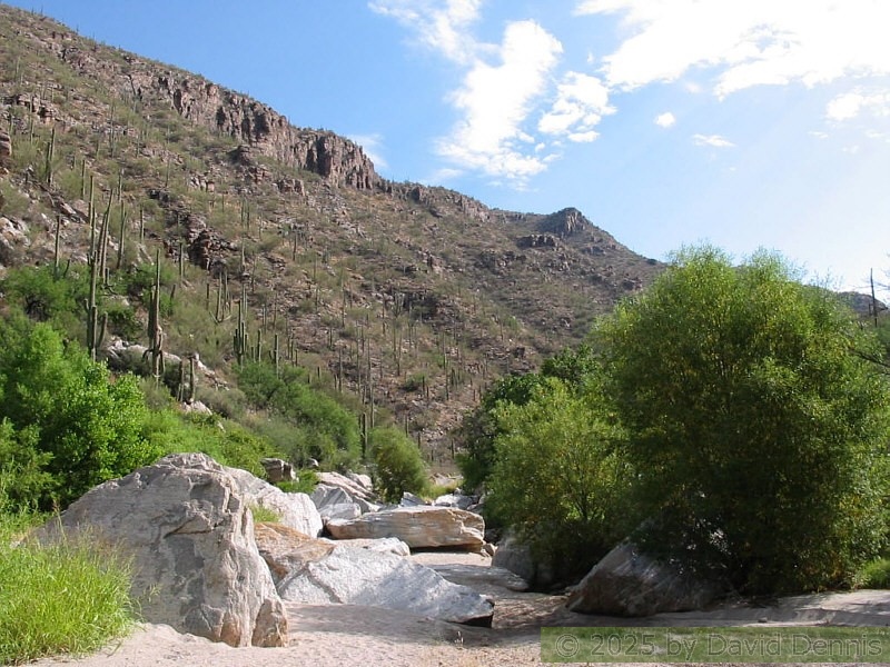These pictures were taken in November, 2000 in Sabino Canyon. There is a three mile trail into the mountains with numerous other trails going off the main one. All access to this area is by hiking or paying to take a shuttle that runs in the area. I was quite fortunate to go in autumn when the trees were at their best. When you add autumn leaves, rivers, mountains and cactus, you come up with some very interesting pictures.